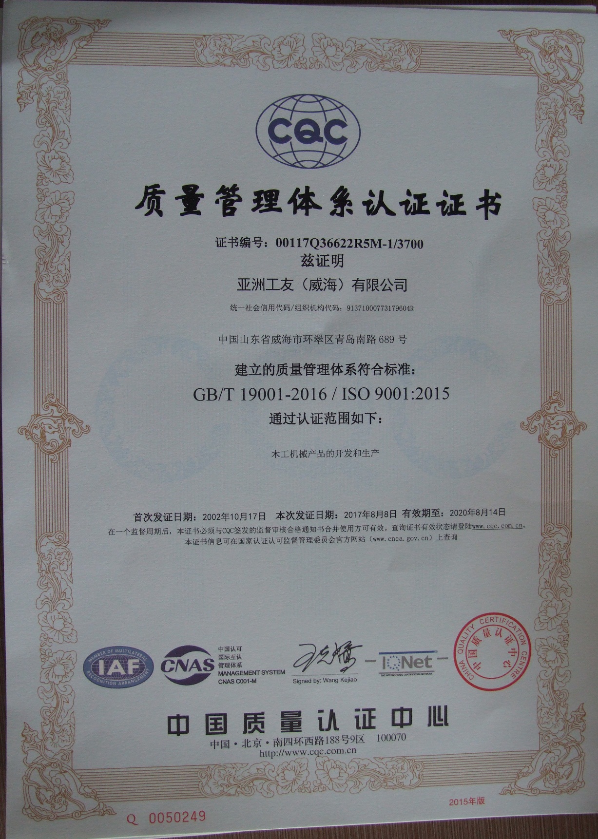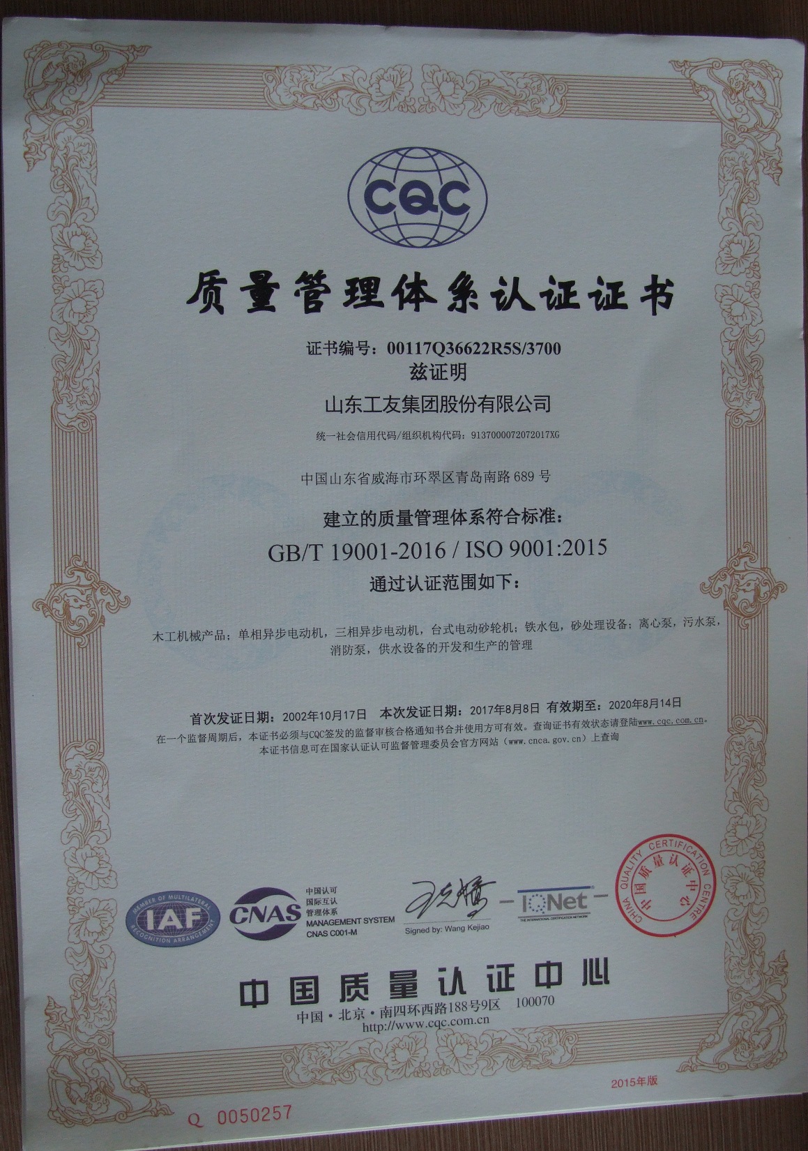 8月15日,公司收到了中國(guó)質(zhì)量認(rèn)證中心頒發(fā)的新版標(biāo)準(zhǔn)證書。至此,2017年體系換版換證的工作圓滿結(jié)束。
