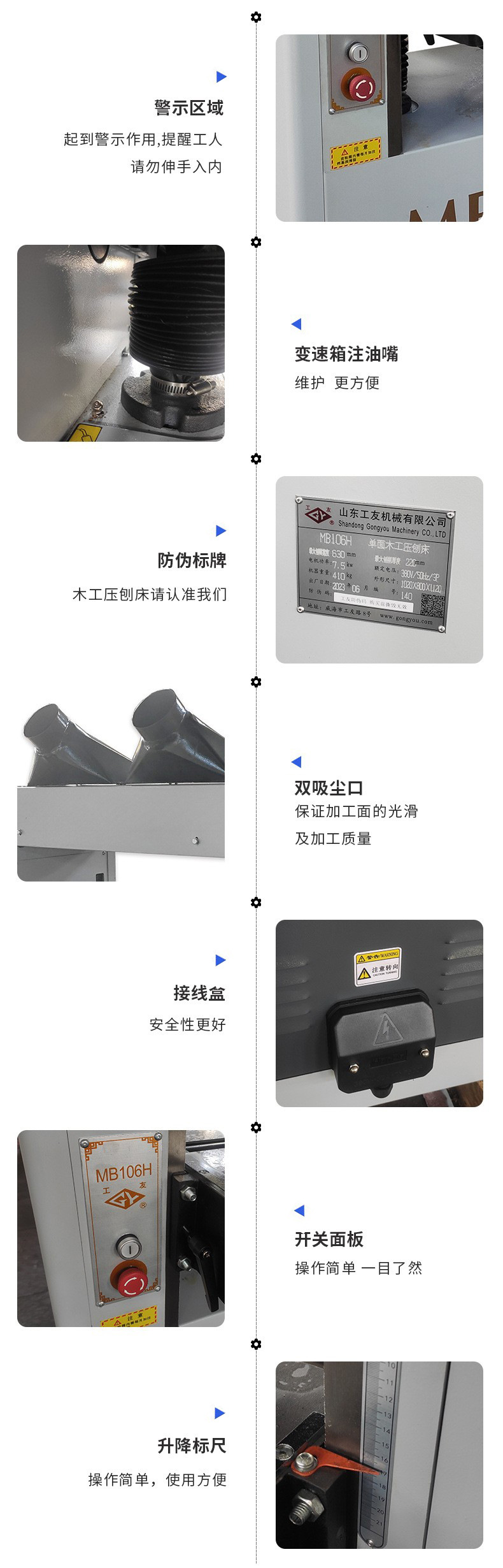 該機(jī)床送料平穩(wěn),前壓輥采用分段活動(dòng)結(jié)構(gòu),可同時(shí)送入厚度相差2毫米以內(nèi)的多塊材料;前后壓料器調(diào)節(jié)方便,可加工薄板;工作臺(tái)升降裝置結(jié)構(gòu)合理,操作平穩(wěn)輕便;獨(dú)特的主軸結(jié)構(gòu),保證良好的加工質(zhì)量。該機(jī)具有兩級(jí)送料速度,可滿足不同加工工件的要求。